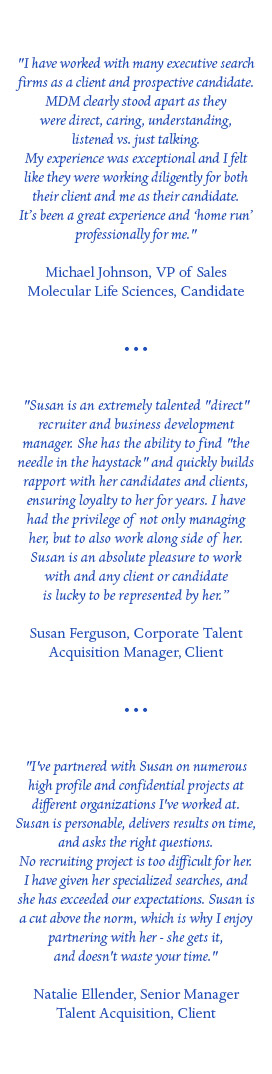 After over 20 years of high integrity recruiting, our search process is known for identifying targeted candidates that meet our client’s specific needs. Our systematic approach is organized into the following three key steps:
